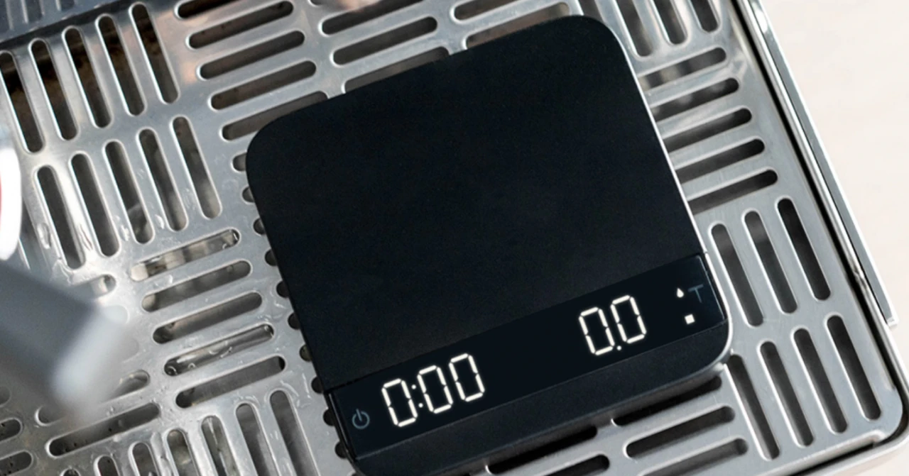 Automatisches Taragewicht für schnelle Messungen. Ein Auto-Start-Timer startet, wenn das Aufgießen beginnt und zwar hier bei dem ersten Tropfen, z.B. bei Pour Over in den Filter. Die Waage ist paßgenau für die Abtropfschale.