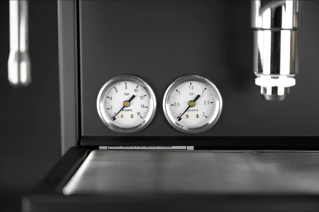 Zwei Rundmanometer zeigen links unten auf der Frontseite den Kesseldruck (0~3 bar) und den Pumpendruck (0~15 bar) an.