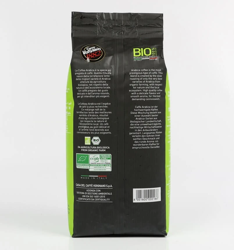 Der Anspruch der internationalen Kunden hat dazu geführt, dass Caffè Vergnano eine hochwertige Bio Kaffeelinie erarbeitet hat. Damit reagiert der italienisch Kaffeeröster perfekt auf die Wünsche und Ansprüche der Kaffeeliebhaber, die besonderen Wert auf biologische und organische Produkte legen. Die Bohnenmischung aus 100% Arabicabohnen wurde lange und schonend geröstet, was zu einem besonders milden Kaffeegenuss führt. Im Nachgeschmack erleben Sie ein vielseitiges Aroma mit angenehmer Süße. Die aufwändige Kreation besteht aus neun verschiedenen Arabicasorten aus den besten Anbaugebieten. Innerhalb dieser Anbaugebiete wurden final die Bohnenqualitäten ausgewählt, die den TOP Ansprüchen des Rösters entsprechen. Langsames Rösten verleiht den Bohnen ihren sanften Geschmack und das runde Aroma. Alles in allem genießen Sie mit dem Caffè Vergnano Bio / Organic einen wunderbaren Kaffee für anspruchsvolle Genießer, der letztlich durch seine weiche, samtige Crema, die sehr stabil in der bleibt, überzeugt.