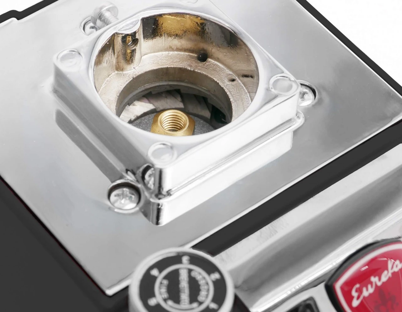 Die patentierte 4-Punkt-Aufhängung des Mahlwerkes ermöglicht eine stufenlose Einstellung des Mahlgrades über den kleinen Drehknopf am Gehäuse, das für sich genommen schon ein sehr geiles Detail ist. Die Eureka Mignon MCI ist durch das innovative und gleichzeitig robust gebaute Mahlwerk problemfrei zu reinigen und Fremdkörper können sehr einfach entfernt werden.