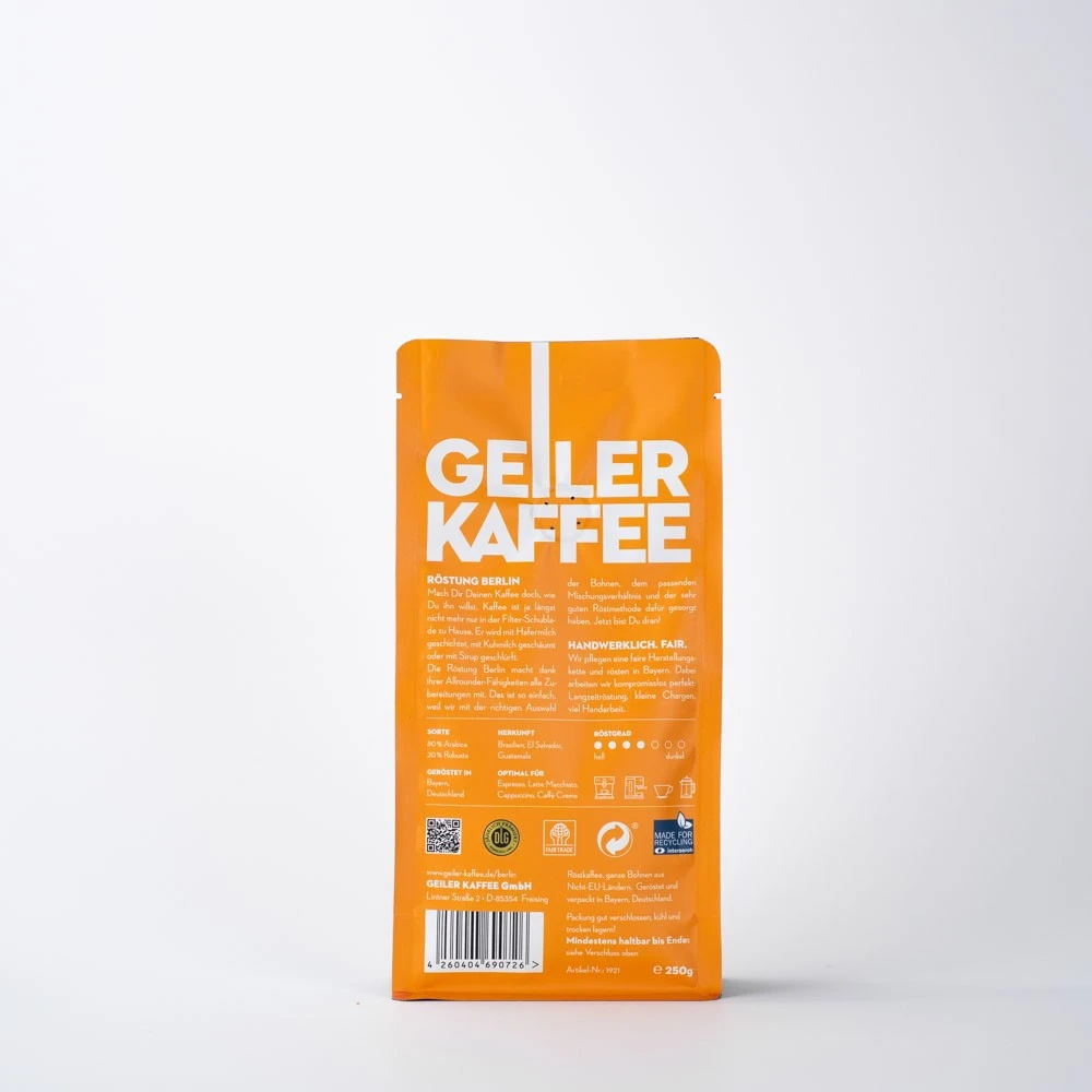 Das neue Label GEILER KAFFEE verspricht dem Kaffeefan eine ganz neuen, klaren und ehrlichen Kaffeegenuss. Ohne viel Schnickschnack wird bei dieser Kaffeemarke auf das Wesentliche wert gelegt – nämlich den Kaffee. Der muss sprichwörtlich „geil“ sein, sonst ist er nicht gut genug. Die Kaffeeröstung BERLIN ist geprägt von Berliner Kaffeetrends.
