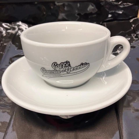 - schlichtes, weißes Tassendesign – wertiges Porzellan mit Goccia a Goccia Caffe Logo
