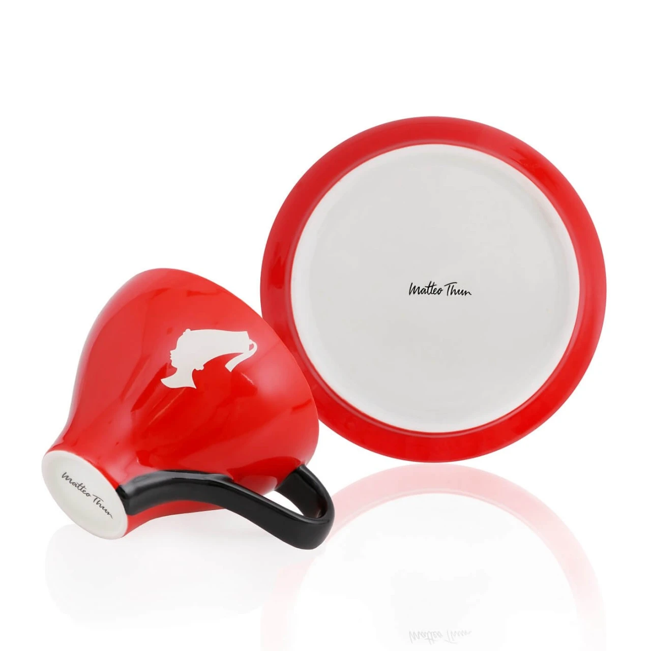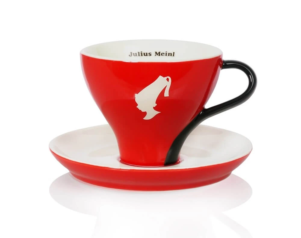- Optik: Schönes modernes Cappuccinotassen design – wertiges Porzellan in rot/schwarz mit Julius Meinl Logo