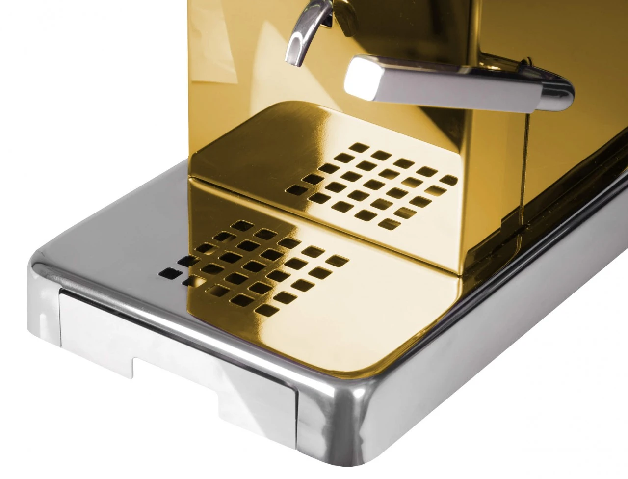 Der Standfuß der Piccola e Piccola ist seit Mitte 2017 aus formgepresstem Metall und die Abtropfschublade wurde leider nicht auch in Metall geformt, sondern in Kunststoff. Diese Änderungen fließen derzeit ein und unser Bestand an Maschinen wird sukzessive erneuert.