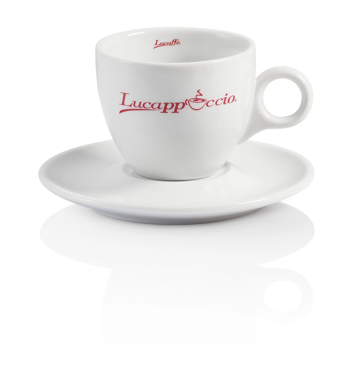 Die neue Lucaffe Kaffeetasse weiß mit rotem Druck außen und kleinem Logo innen