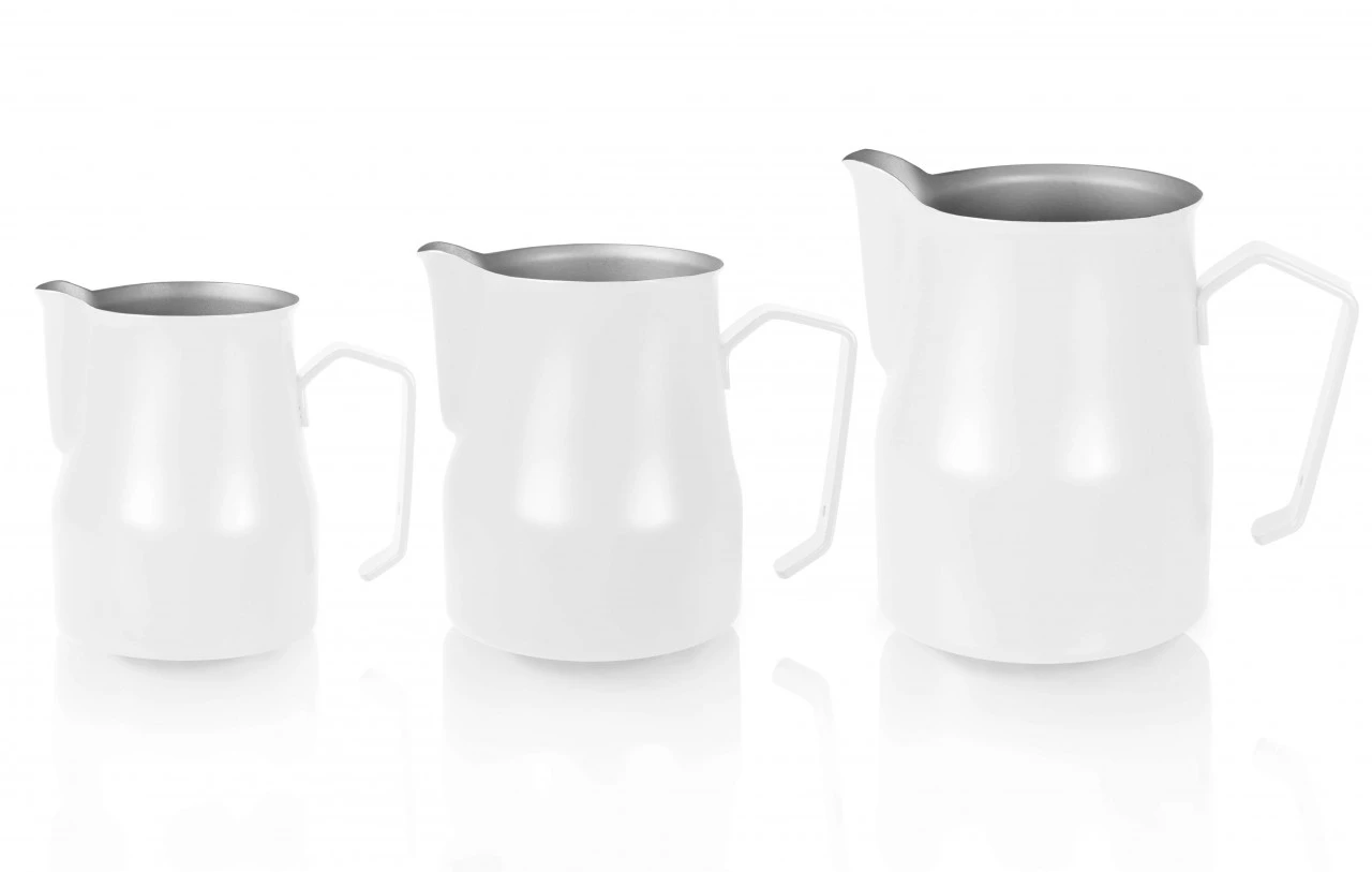 Die Mota-Milchkanne besteht aus Edelstahl 18/10 – das bringt ein schönes Grundgewicht der Kanne und sie liegt schöner in der Hand. Beim Aufschlagen (um die großen Bläschen zu eliminieren) ist ein dumpfes Klopfen anstelle eines nervigen, blechernen Geklappere zu hören. Die Teflon-Beschichtung im Inneren der Kanne sorgt dafür, dass sich die Milchreste schnell und einfach lösen und ausgespült werden können. Außen ist die Kanne weiß lackiert und damit ein besonders edler und hochwertiger Hingucker für Ihre Kaffe-Bar!