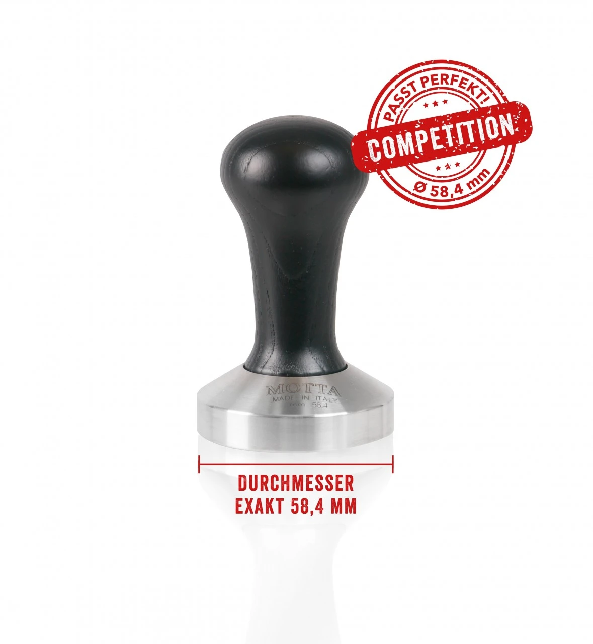 Hochwertiger MOTTA mit auswechselbarem, schwarzem Eichenholz Griff und 58,4mm planer (flacher) Stempelplatte mit Competition Durchmesser. Der Motta Tamper beeindruckt durch sein gewollt hohes Gewicht und der super Passform. Die gute Passform sorgt dafür, das der Tamper nicht im Siebträger verrutscht und vereinfacht dazu auch noch das gerade Einführen des Tampers in den Siebträger. Der Tamper liegt sehr bequem in der Hand und ist aus hochwertigem Eichenholz. Zur besseren Reinigung kann man dem Griff von der Base abschrauben. Diesen Tamper finden Sie in unserer gleichzeitig auch in der .