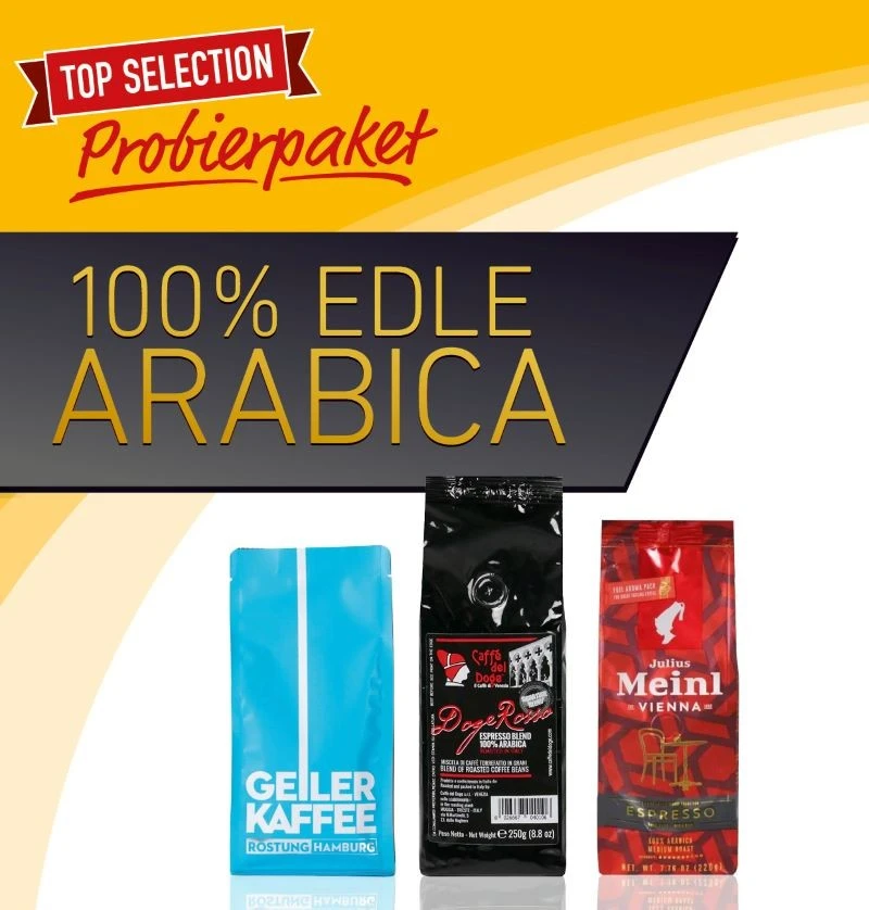 Kaufen Sie einmal und genießen Sie dreimal mit dem 100% EDLE ARABICA Probierpaket mit 2x250g und 1x 220g Espressobohnen