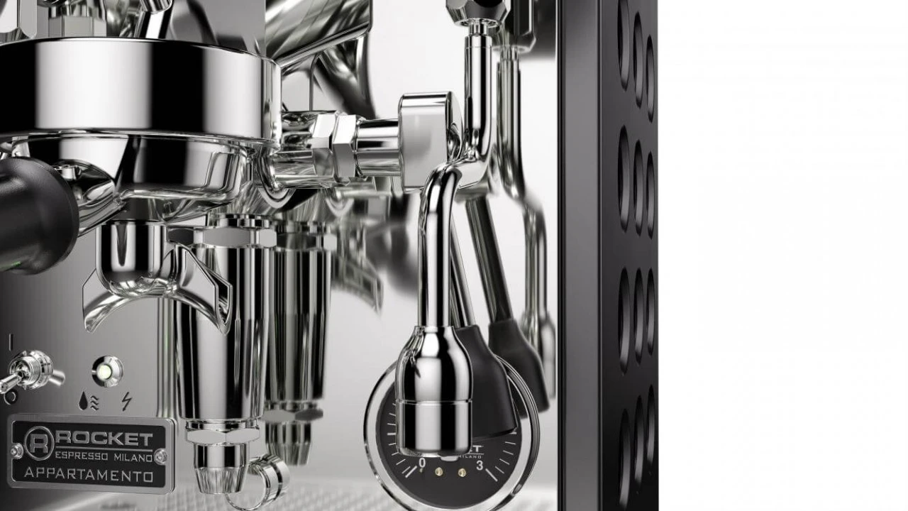 Ästhetisch erhält die neue Appartamento durch die Einführung von zwei neuen Designelementen ein noch stimmigeres Design. Zum einen ist die Maschine an der Rückseite mit einem markant hervorstehendem Rocket Logo versehen und Rundungen zu den Seitenteilen geben ein sehr harmonisches Bild. Zum anderen wurden die unverkennbaren „Appartamento-Kreise“ an den Seiten der Maschine durch eine Prägung hervorgehoben, die ihnen einen dreidimensionalen Charakter verleiht. Das zielgerichtete Design der neuen Brühgruppe vermittelt Stärke, Zuverlässigkeit und Präzision. Diese drei Eigenschaften sind die Essenz des Appartamento TCA. Die klassischen Rocket Drehknöpfe wurden verfeinert und die schlankeren Formen stehen im Kontrast zu der starken Dampf- und Wasserabgabeleistung der neuen Maschine.