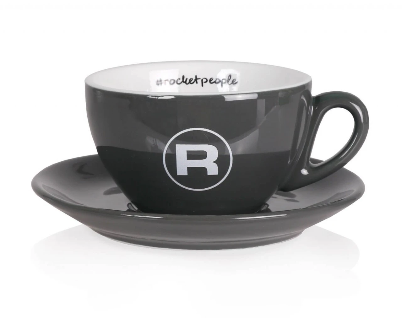 Die Cappuccino Tasse kommt in einem schönen satten Grau und hat das berühmte Rocket Logo außen aufgedruckt.